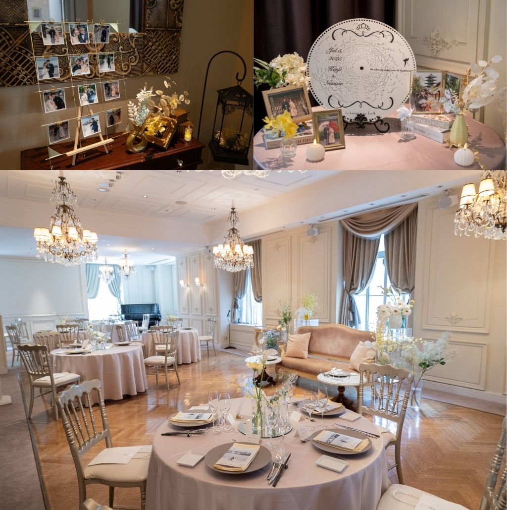 ゲストをお迎えする白亜の待合室『Rose(ローズ)』に飾られたのは、おふたりの前撮りお写真や手作りのフォトパネル。