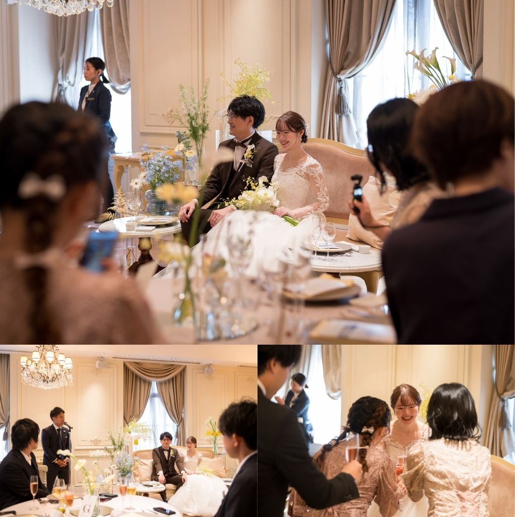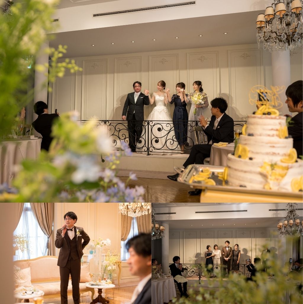 ベールアウトをし、ブラウスを着用してイメージチェンジされた新婦様と、少しリラックスされたような新郎様が、今日のために集まってくれたゲストの皆様へご挨拶をされました。