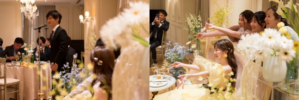 パーティ後半は、勤務先の同僚様よりお祝いスピーチをいただいた後、各テーブルのゲストと笑顔を交わしながらお写真タイムを愉しまれました。