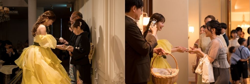 新郎新婦様はお色直しのため、エスコート役のゲストと共に会場を後にします。