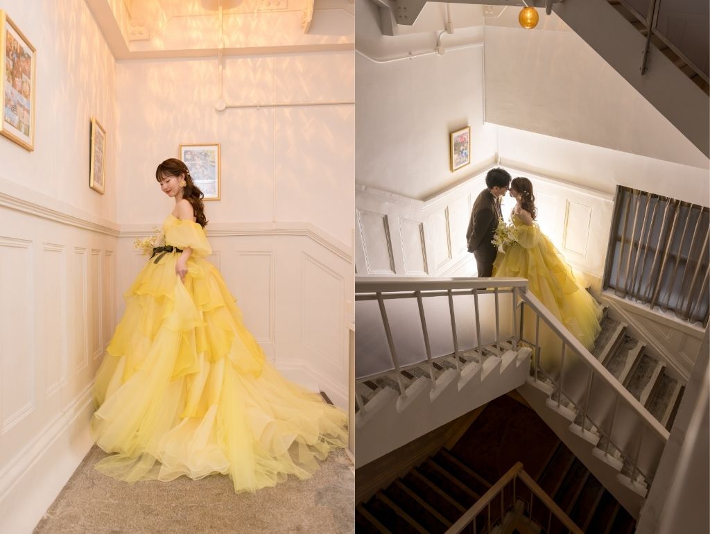 新婦様はテーマカラーのレモンイエローのドレスに身を包み、ヘアスタイルまでこだわったセンスある装いで、華やかな会場に映えます。